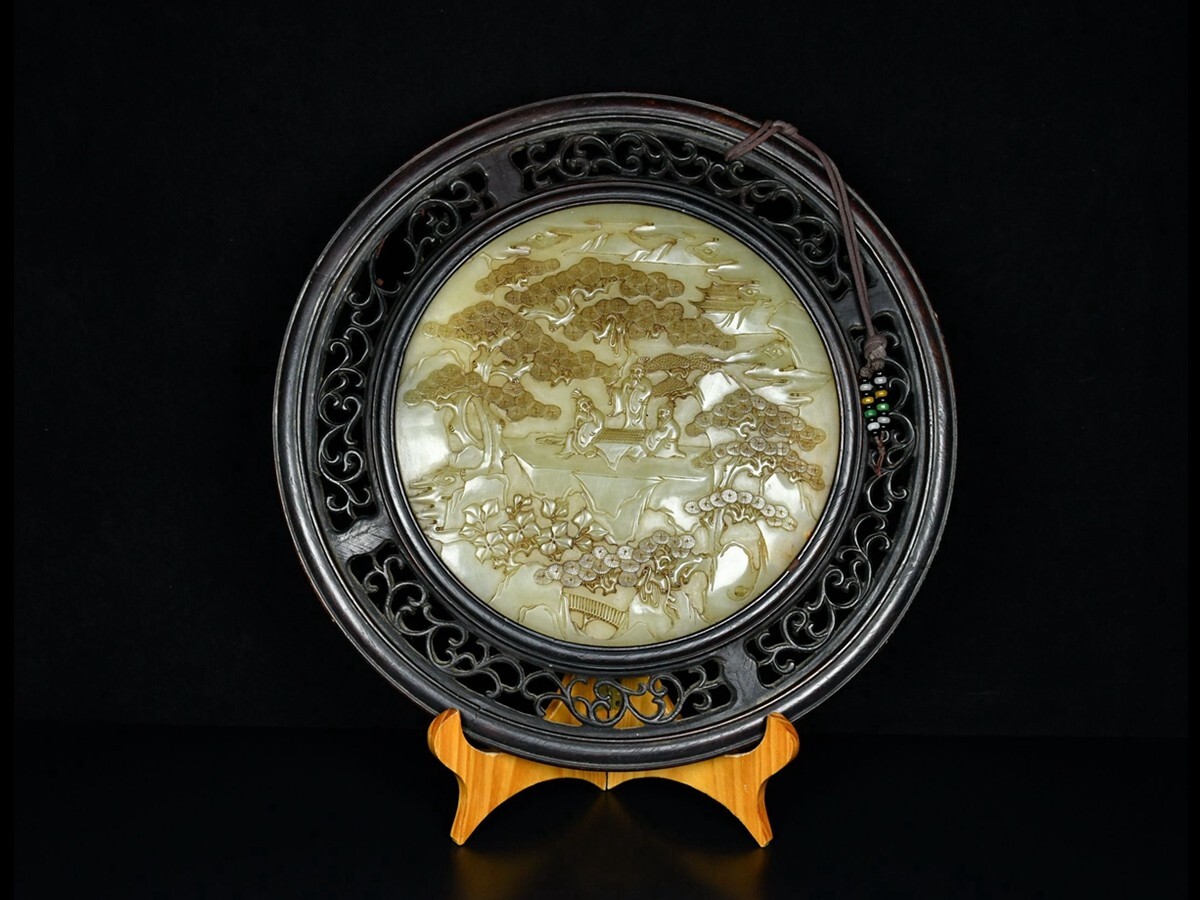 - 「清時代 和田玉 彫り 松下対奕 屏風」極細工 擺件 中国古賞物 古美術 旧蔵出