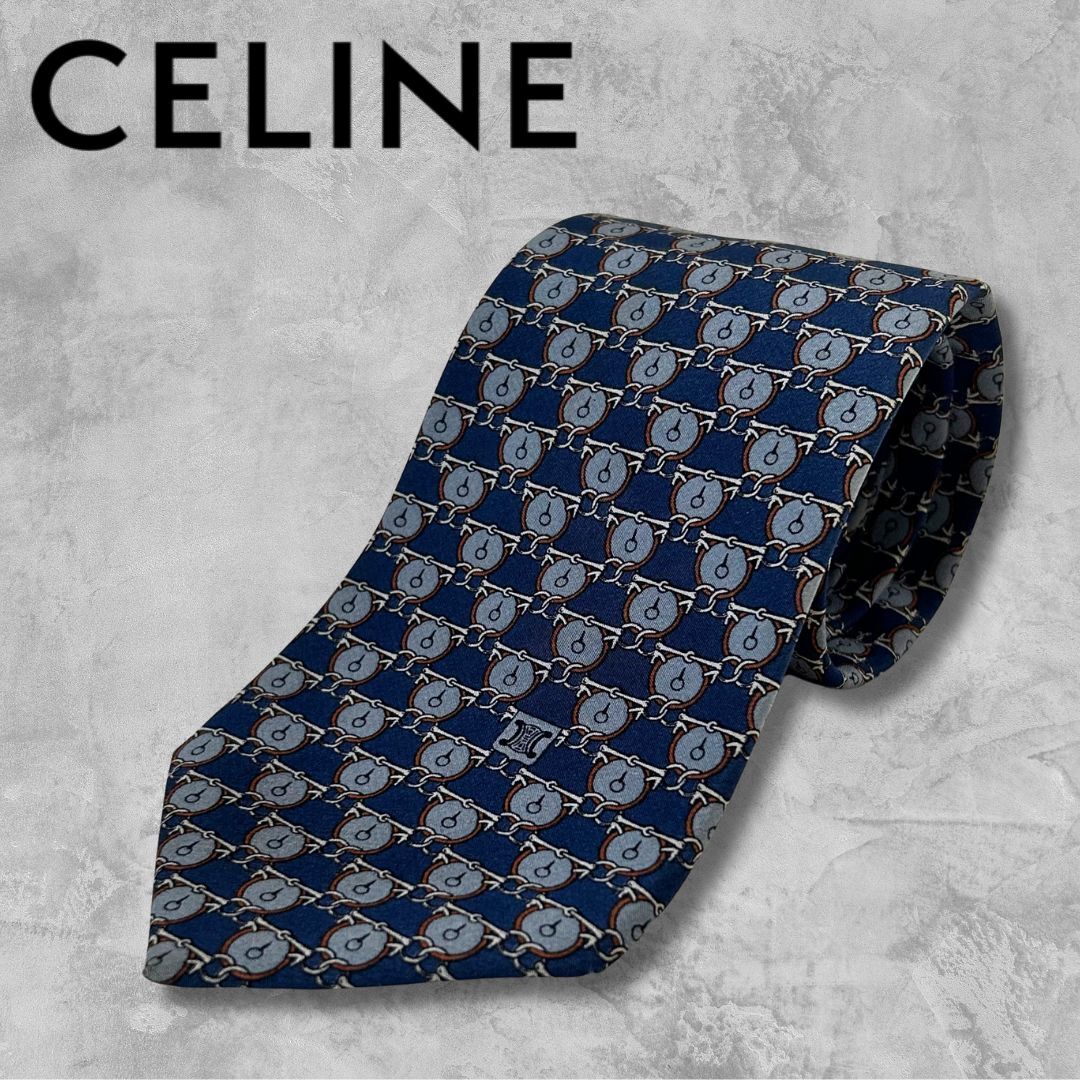 - 【美品】セリーヌ ネクタイ トリオンフロゴ ブルー系 シルク100% 8cm幅