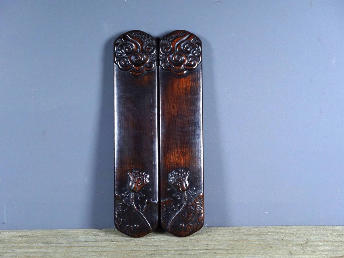 - 【超珍館蔵】檀木製 細密彫 蓮蓮高升紋 鎮尺 置物 賞物 古賞物 古董品 古美術品 時代物 旧家蔵出 稀少珍蔵品