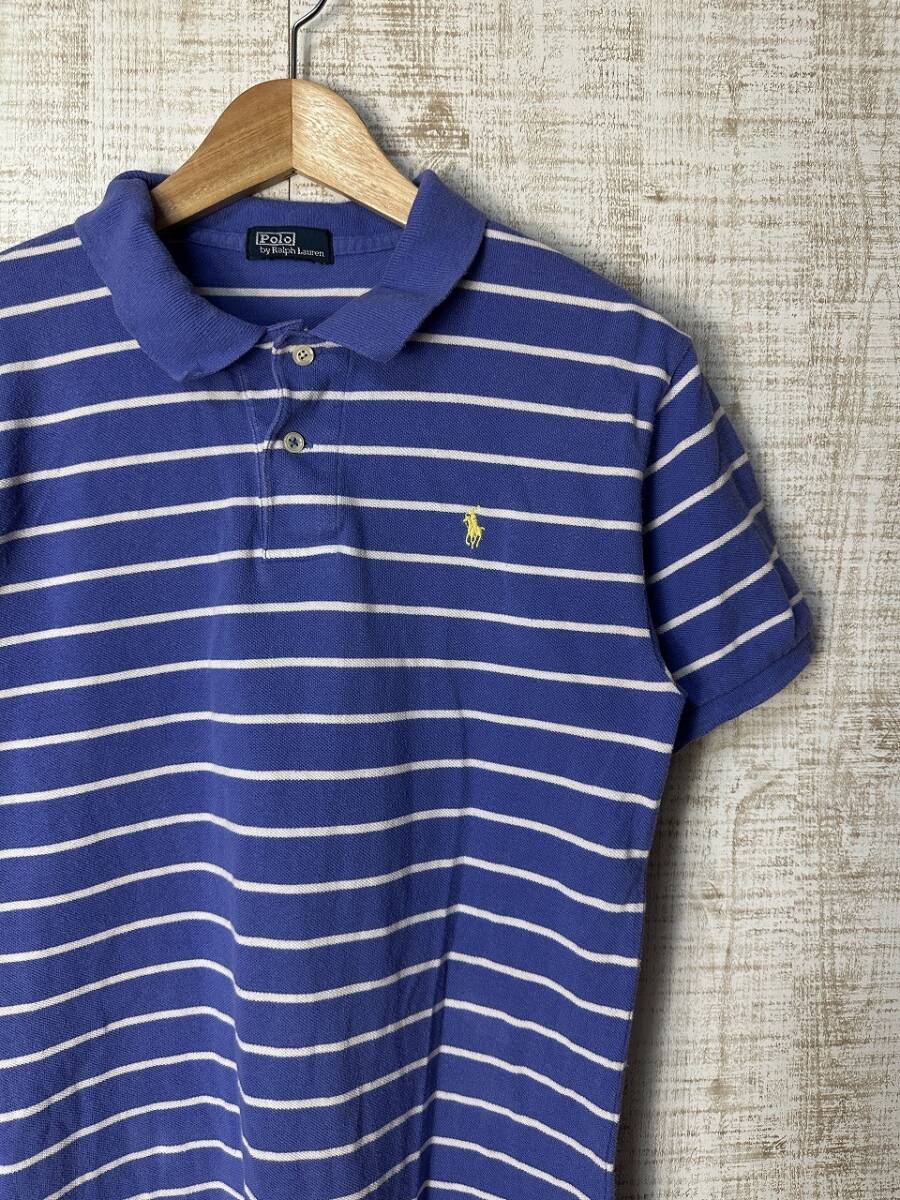 - ☆US古着 POLO Ralph Lauren ラルフローレン ポロシャツ ボーダー ポニーロゴ刺繍 ブルー青×白【Mくらい】鹿の子 ◆5007◆