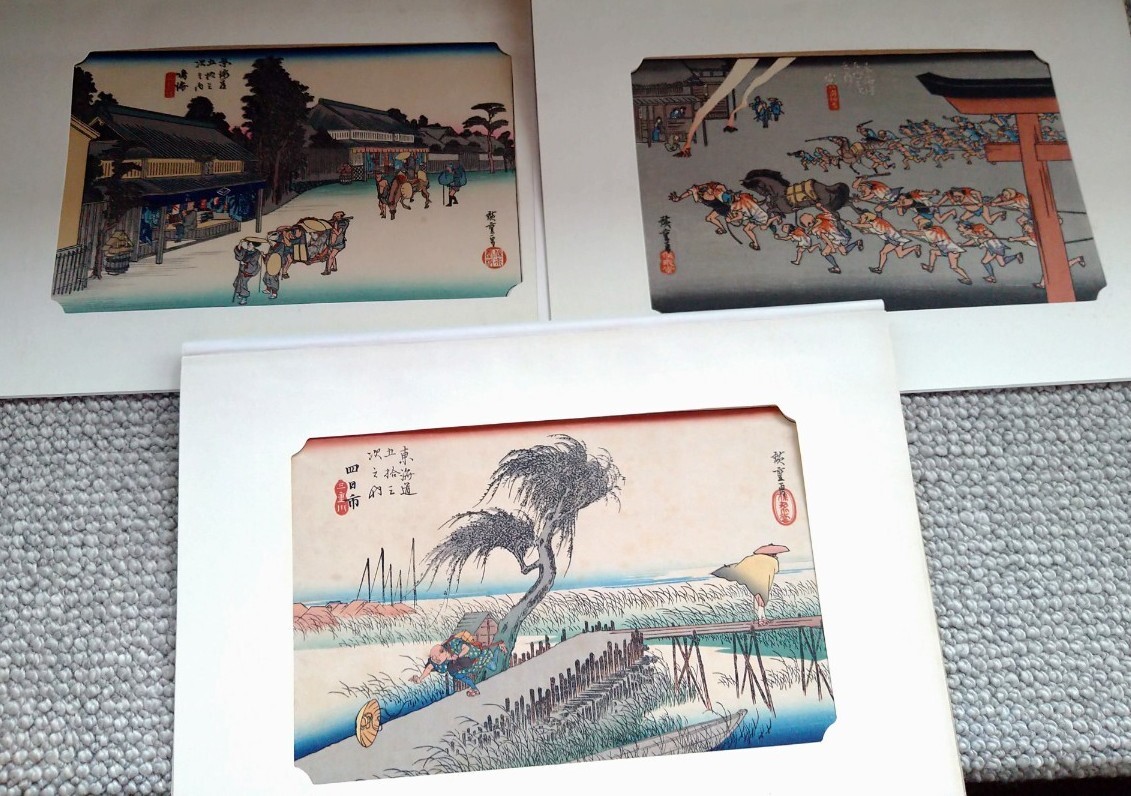 - 【木版刷 浮世絵3点セット】歌川広重 東海道五十三次 「鳴海 名物有松絞」「宮 熱田神事 」「四日市 三重川 」 高見沢研究所 真作 べらぼう