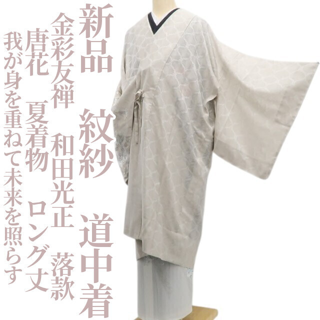 - tomihisa 新品 紋紗 金彩友禅 和田光正 落款 唐花 夏着物“我が身を重ねて未来を照らす”正絹 仕付け糸付 ロング丈 道中着 6204