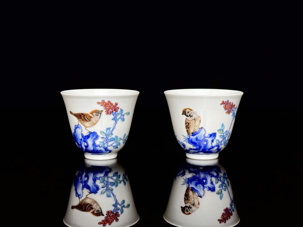 - 「清 乾隆年製 陶磁器 青花加彩 麻雀瑞果竹葉 題詩 杯一対」染付 置物 擺件 古賞物 中国古美術 旧蔵出
