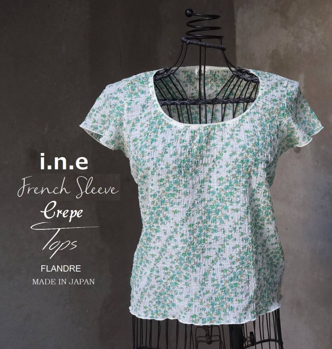 - 日本製 インエ i.n.e 緑 白 小花柄 ちりめん クレープ フレンチスリーブトップス 2 M相当