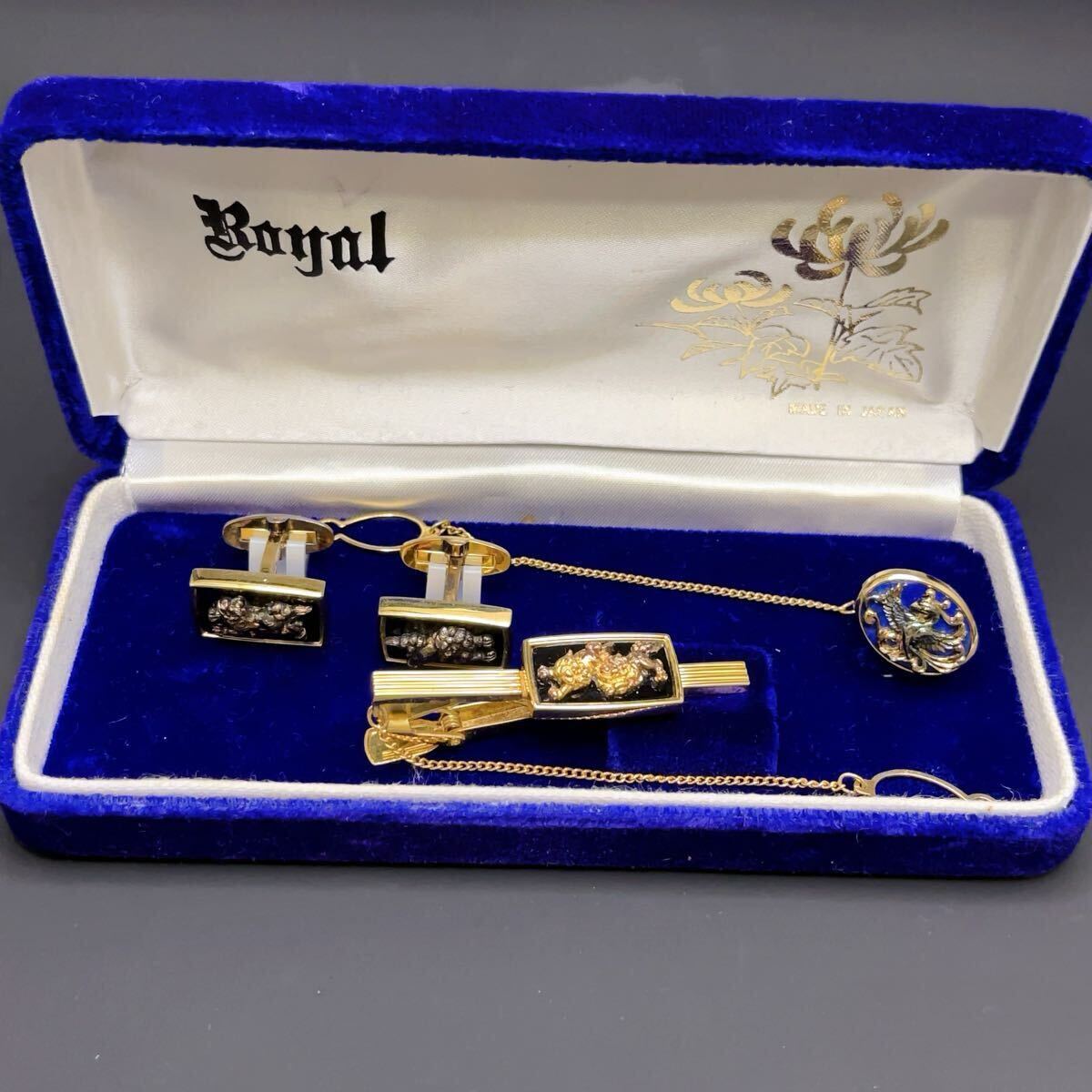 - 希少STERLING シルバー925 彫刻 鳳凰 獅子 ゴールドカラー タイピン カフス ピンタック セット