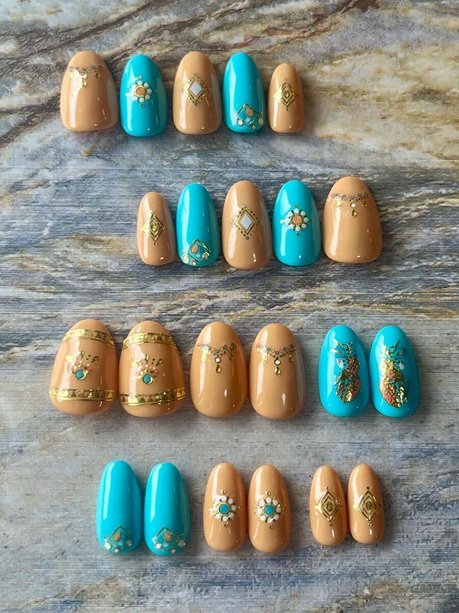 - ハンドメイド ネイルチップ ショートアーモンド ターコイズブルー オレンジ アラビアン風
