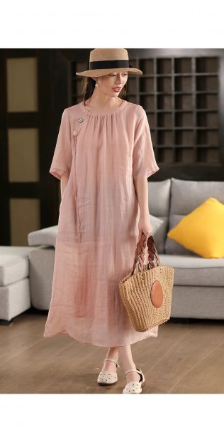 > 25nc ロングワンピース チュニック ナチュラル 苧麻100% 裏地付き ゆったり 大人可愛 肌触り通気性抜群 サラサラ 手作り花飾り付き ピンク