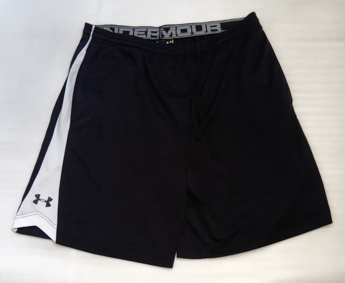 > ☆UNDER ARMOUR サイズL ショート短パンツ半ハーフ ズボン洗濯済LOOSEボトムス黒色ブラック白HEATGEAR伸縮機能ストレッチ アンダーアーマー