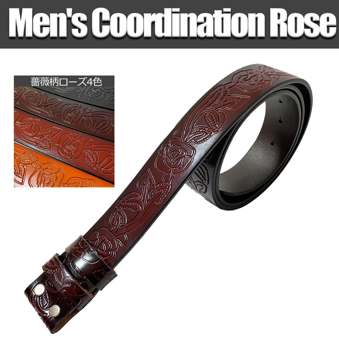 > ■新品/送料無料■ 牛革 ベルト 交換用ベルト エンボス加工 型押し 花柄 バラ 薔薇 メンズ レディース アメリカン ビンテージ 茶ブラウン