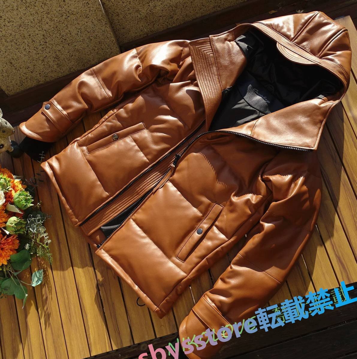 - 冬 ダウンジャケット 本革 羊革 ダウンコート 厚手 レザー 防寒 ライダース 暖かい フード付き 男女兼用 S~4XL ブラウン