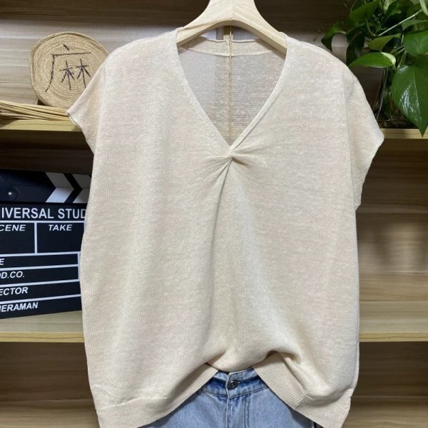 - 25zy サマーニット レディース トップス 高質 ラフ 麻タッチニット チュニック ナチュラル 麻混 サラサラ 涼感 Tシャツ Vネック 肩包む1