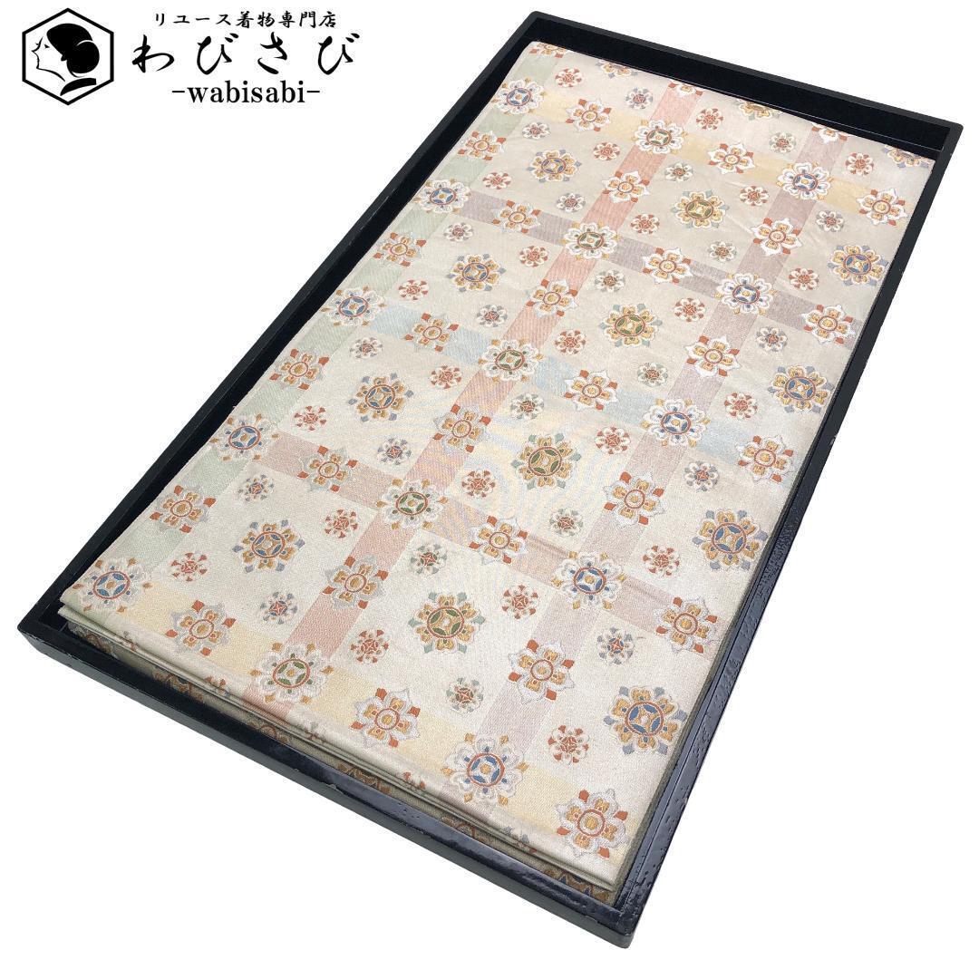 > 袋帯 格子柄に華柄模様 生成色 金銀糸 O-5278 着物 きもの kimono 和服 和装 中古 リサイクル着物 【送料無料】