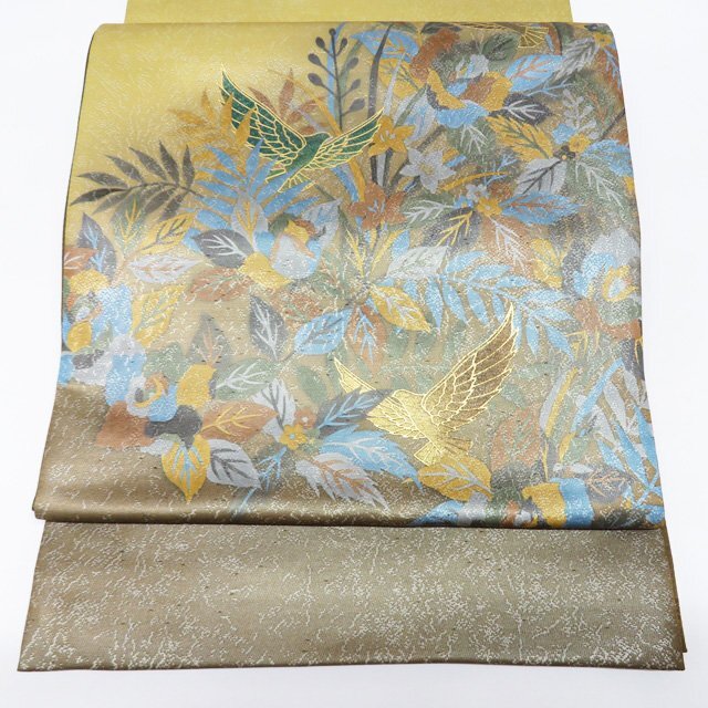 > 袋帯 中古 リサイクル 正絹 フォーマル お太鼓柄 斉藤三才 三才鳥 植物文様 黄金色 多色 金 きもの北條 A1234-4