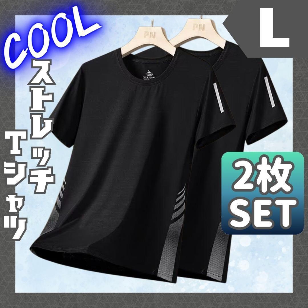 - 吸汗 速乾 ストレッチ Tシャツ L お得な2枚セット クルーネック 接触冷感 涼感 ブラック