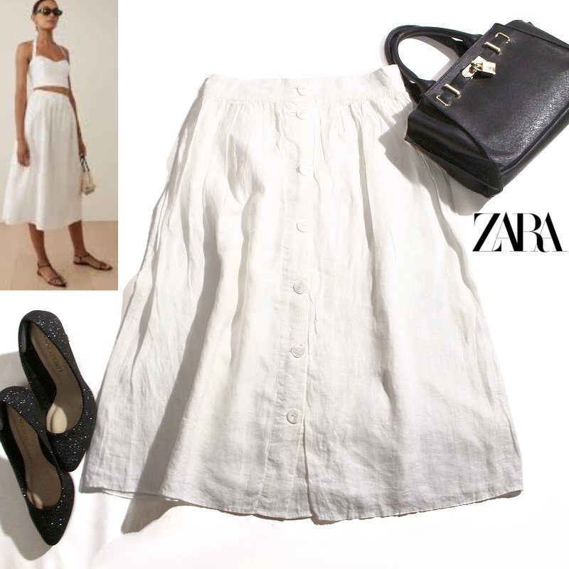 - 美品 ZARA ザラ 春 夏 爽快 麻100% リネン センターボタン ミディ フレアスカート ロングスカート XS ホワイト 白 ナチュラル オーガンジー