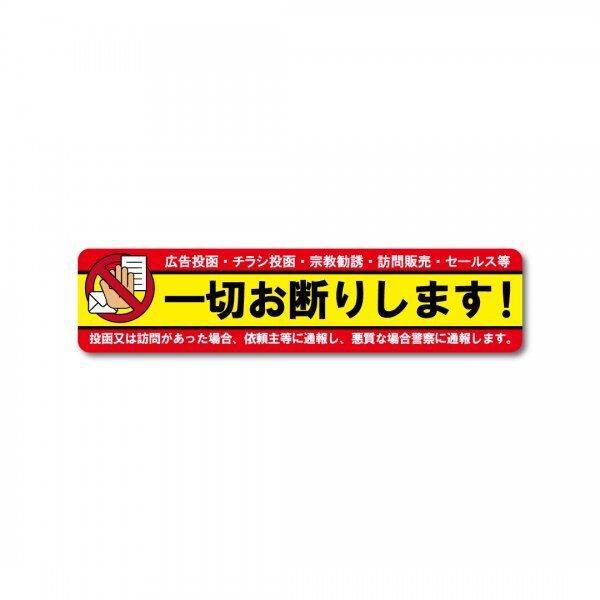 - セールス チラシ 勧誘 一切お断り 防水 高級 ヘアライン ステッカー イエロー レッド 横型 新品150mm x 35mm 悪質な場合 即刻通報 配布禁止