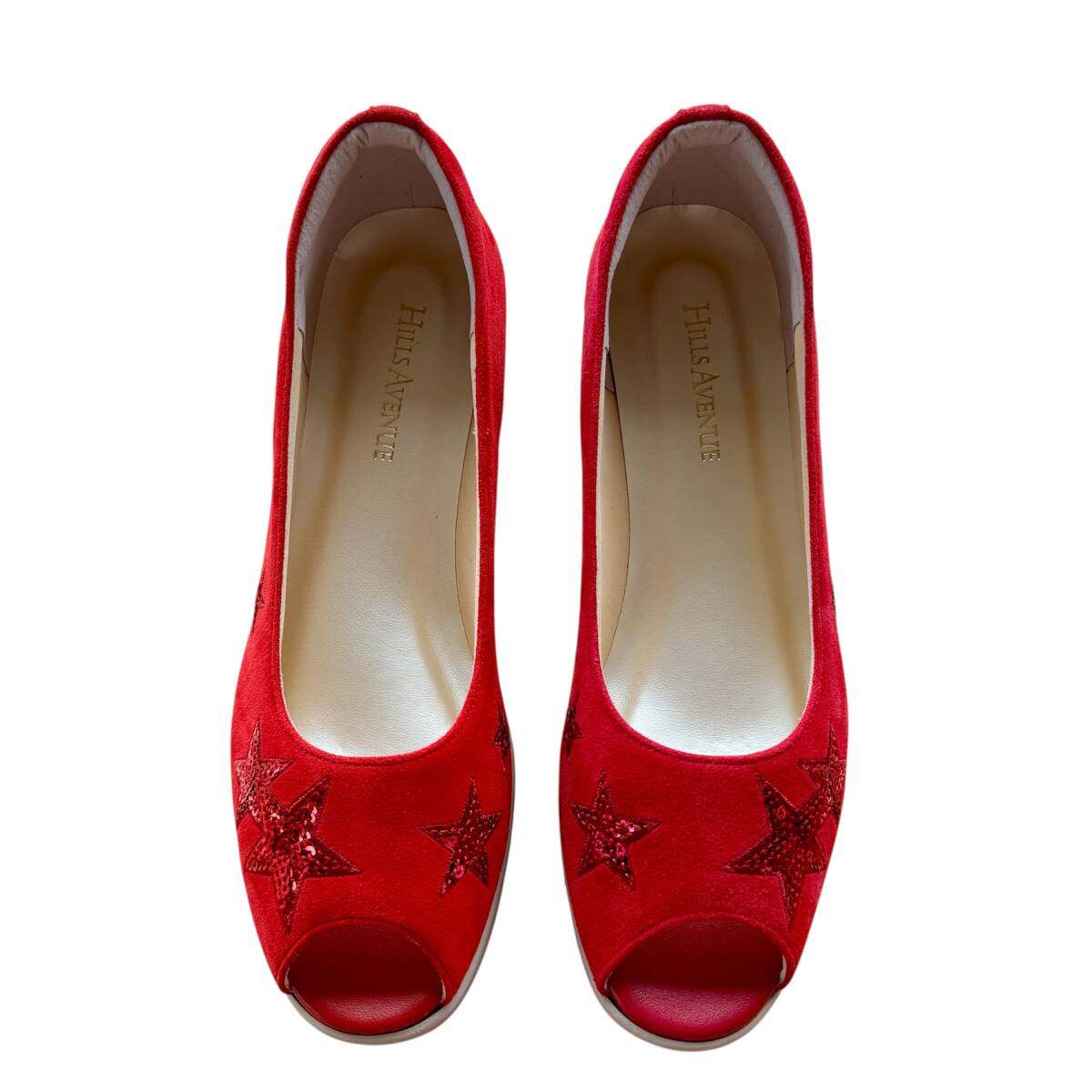 - HILLS AVENUE 未使用 ヒルズアヴェニュー オープントゥ ウェーブソール レッド 星スパンコール 23cm