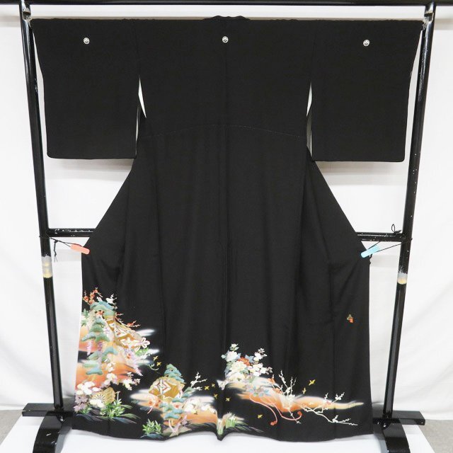 > 黒留袖 着物 中古 袷 五つ紋 蘇州刺繍 落款 花の図 扇子 向い鶴菱 黒色 多色 金 身丈165cm 裄67cm L トール きもの北條 A1237-5