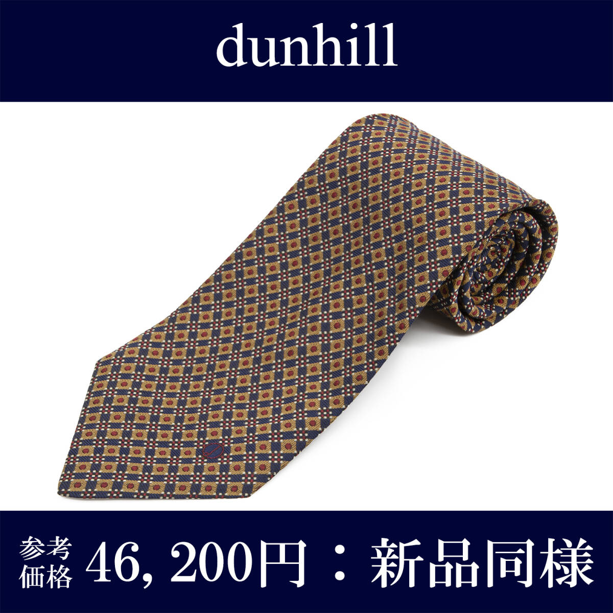 > 送料無料 ダンヒル ネクタイ ジャガード 新品同様 シルク ゴールド 赤 黒 白 ドット ひし形 ダイヤ ロゴ マーク ブランド イギリス製 P094