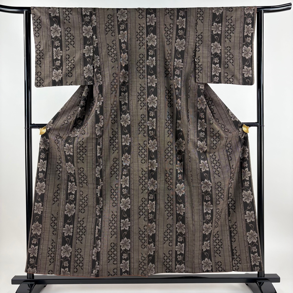 - 紬 身丈157.5cm 裄丈63.5cm S 袷 葉柄 七宝 焦茶色 正絹 美品 秀品 【中古】