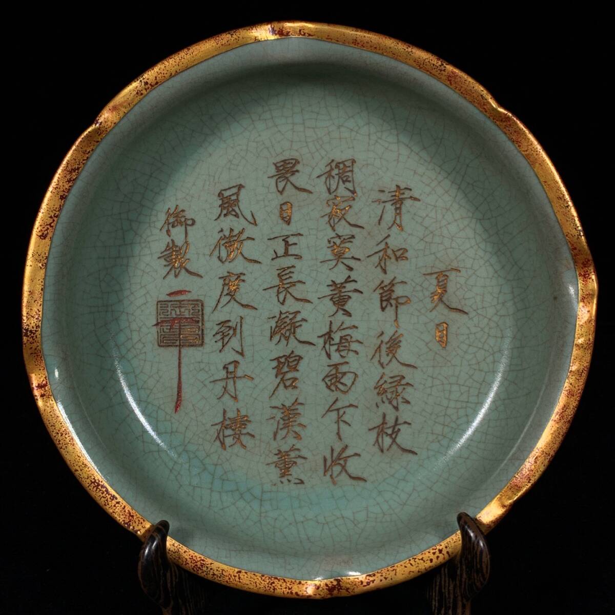 - ▽鴻▽ 宋 古陶瓷品 汝窯 包口 銘文花口洗 陶藝 古賞物 古董品 時代物 稀少珍品 中国古玩 中国古美術