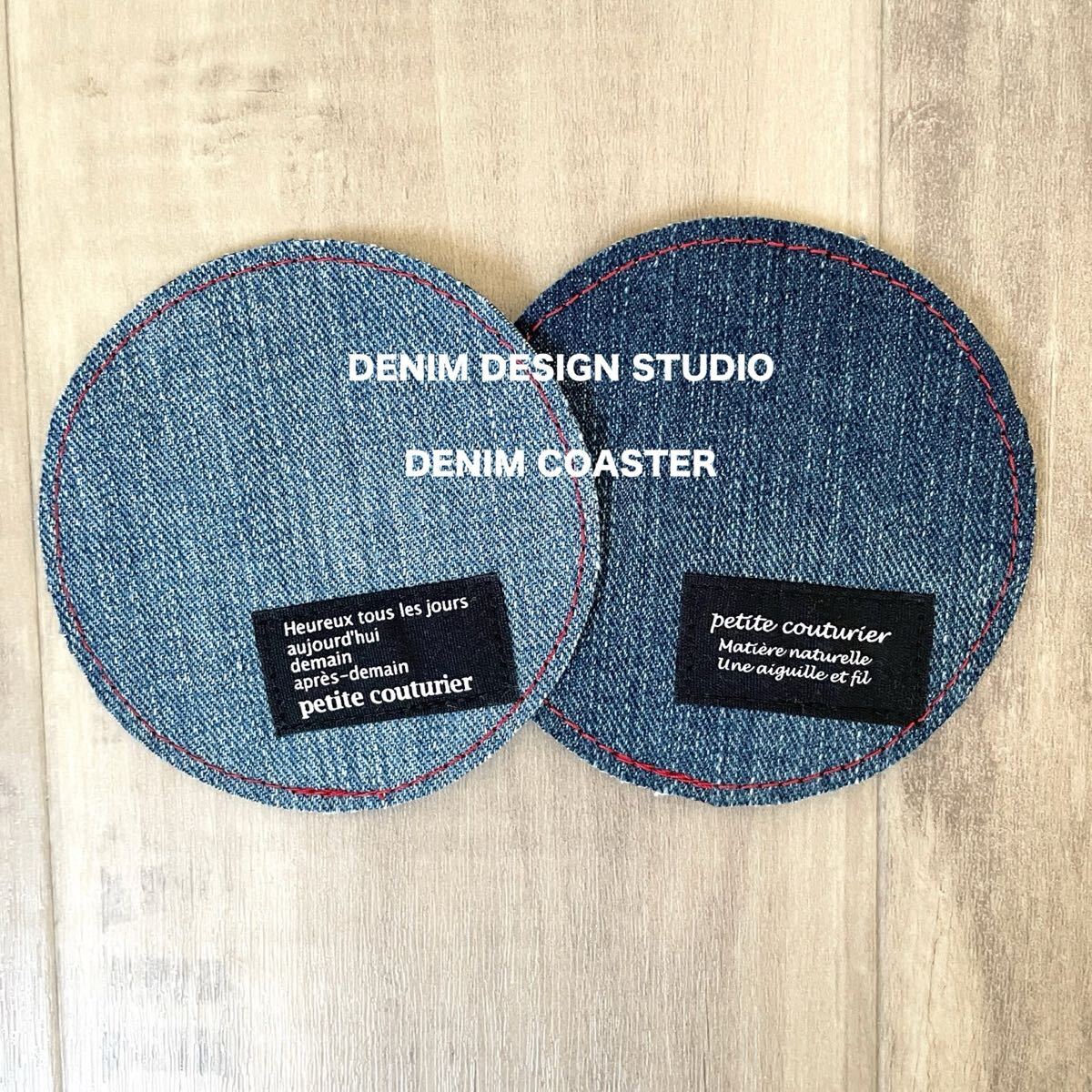 - 【デニムコースター 2枚セット】ネイビーブルー 直径10cm ハンドメイド ジーンズリメイク キッチン配膳用品 レッドステッチ インテリア雑貨