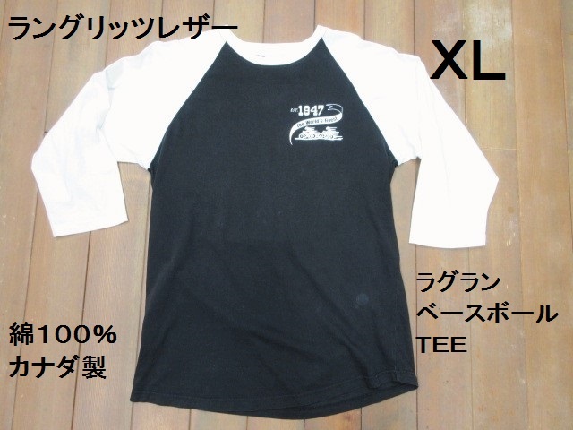 > サイズXL 90s ラングリッツレザー プリント ラグランTシャツ 七分丈 穴補修有り (Langlitz Leathers ベースボールTee