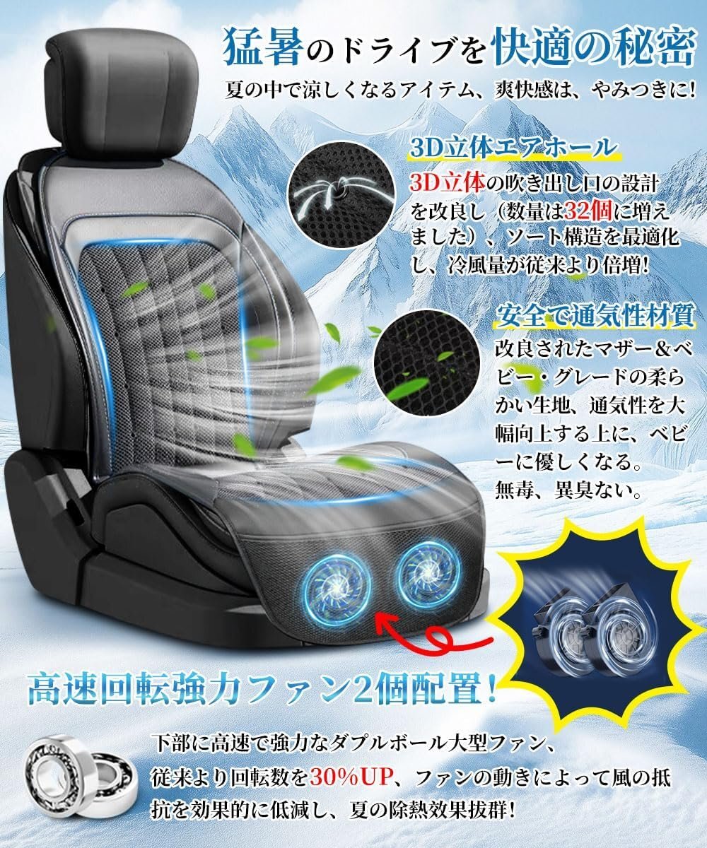 - 【夏のドライブを快適に!パワフル送風&急速冷却】夏を満喫するための究極のクールシート対応策を探しました!涼しさをつくり、蒸し暑さに別れを告げ、熱い夏でもドライブ快適♪丁寧な開発企画、ファンの数が多ければ多いほど風が通り、通気効果が良くなるという古い考えを超え、超強力デュアルボールベアリング大型ブロワーファンを作りました!シートカバー下部のファンだけで吸い込んだエアコンの冷たい空気を座面、バックさらに首元に届けます。2枚直径15cmの大型ファン、高速回転でファンの動きによって風の抵抗を効果的に低減し、回転速度が8800回転/分に達し、1枚は10枚小型ファンに相当します。ソート構造を最適化し、冷風量が従来より40%倍増!