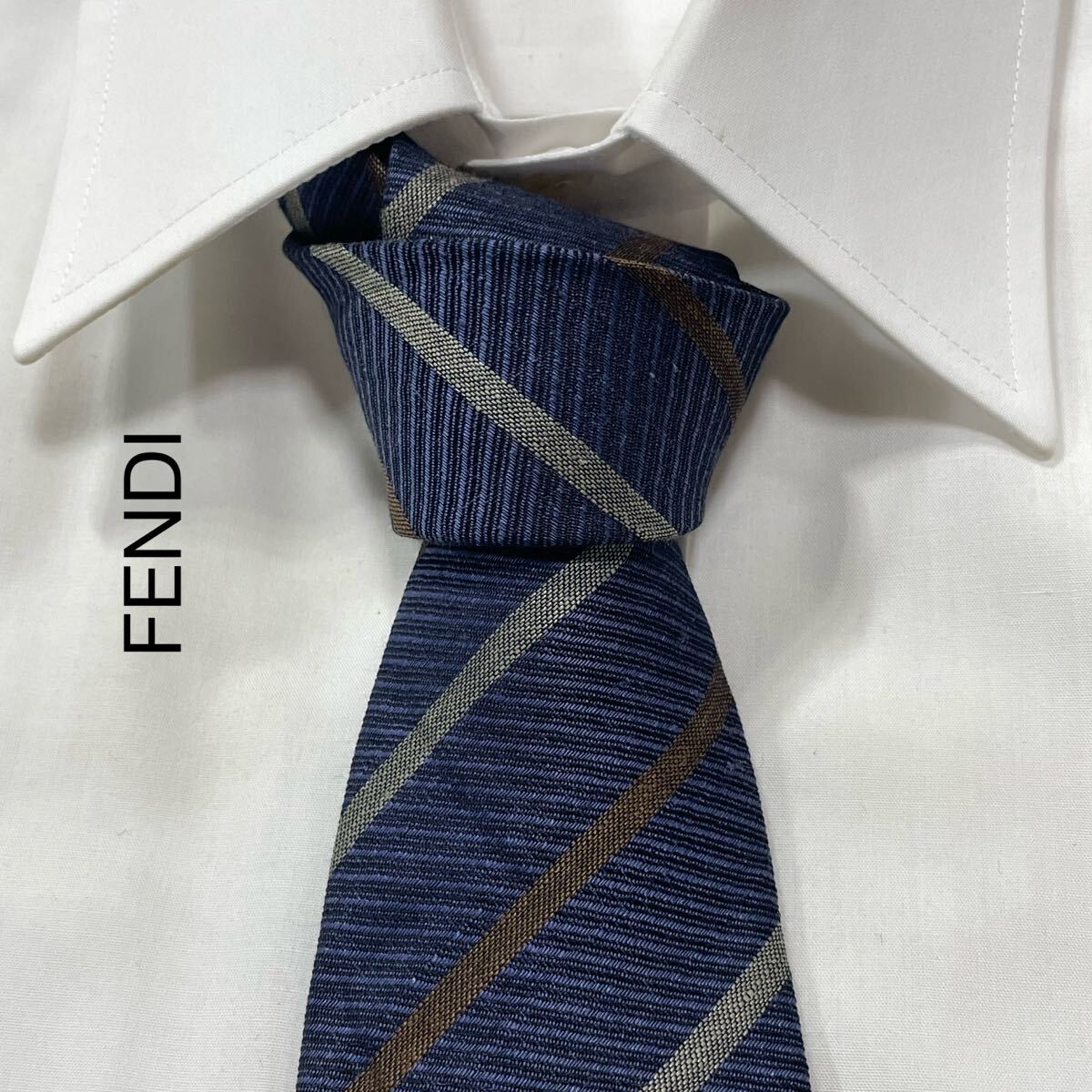 - FENDI フェンディ ストライプ シルク リネン ネクタイ イタリア製 ネイビー グレー ブラウン TG2650