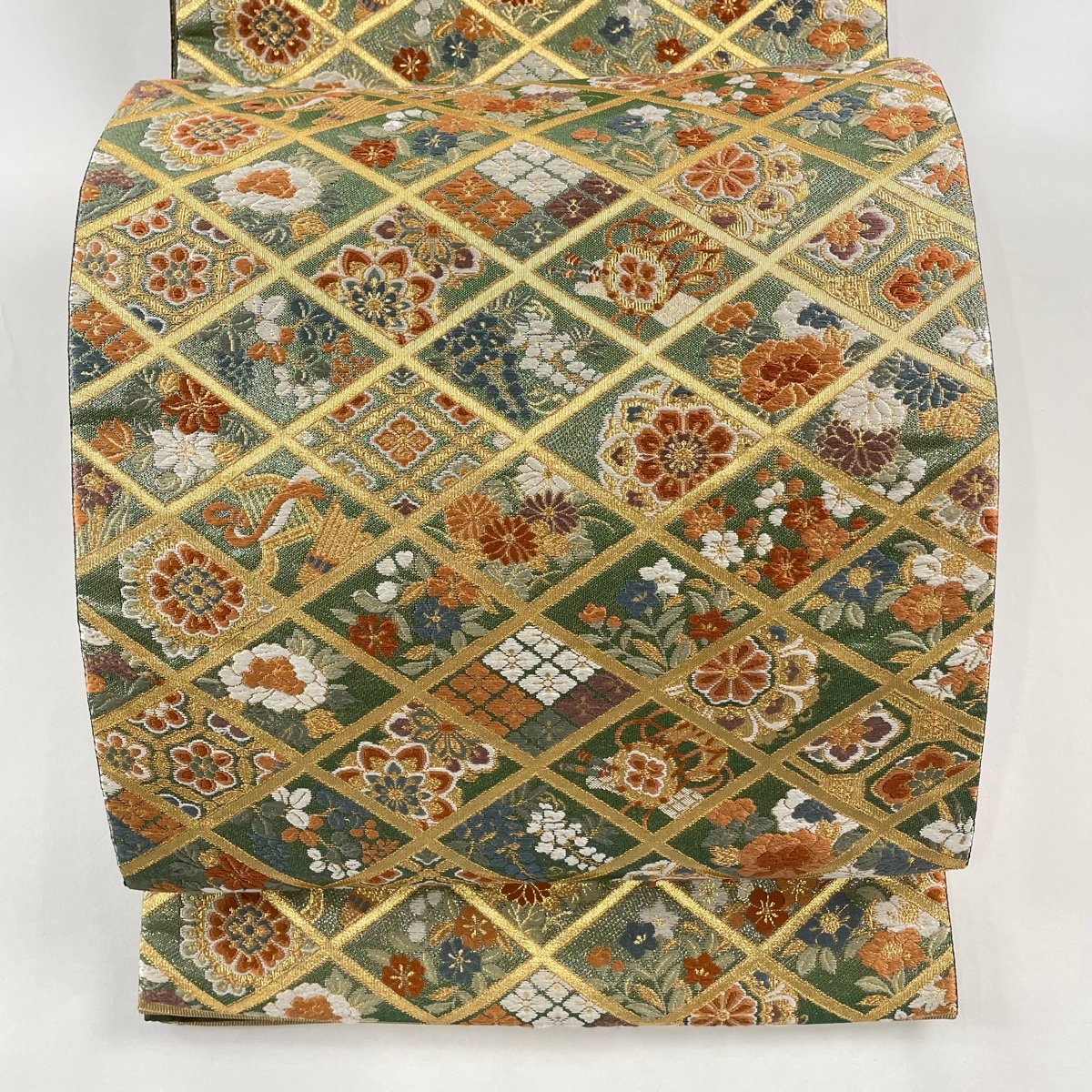 - 袋帯 美品 秀品 斜め格子 草花 刺繍 金糸 緑 六通 正絹 【中古】