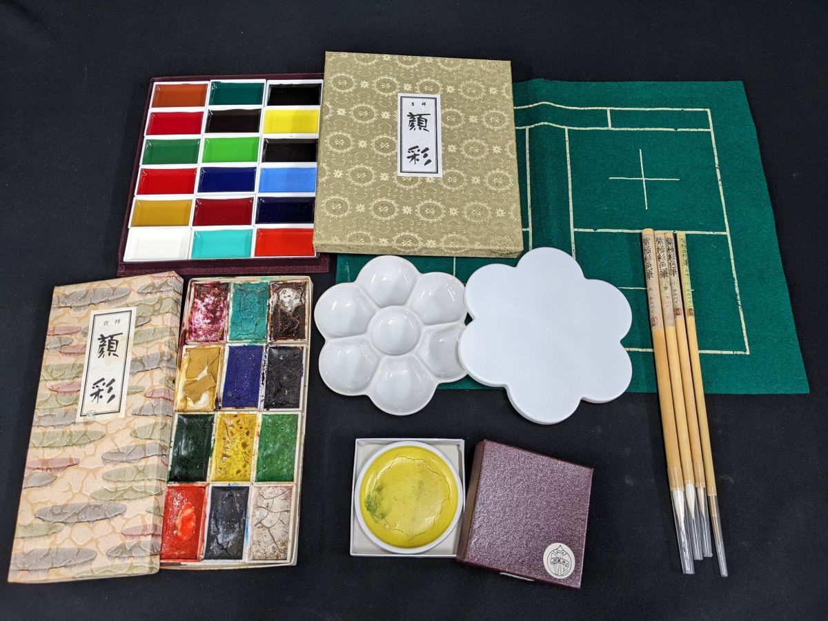 > T707 日本画用画材9点セット 吉祥 顔彩 丸型顔彩(山吹色) 紫極彩色筆(大中小)面相筆 新品計4本 花形パレット 下敷/80