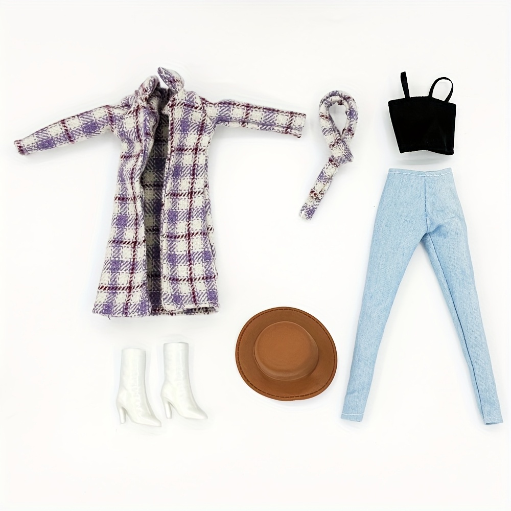 - 着せ替え人形 ロングコート タータンチェック 白 ブーツ 交換衣装 1/6スケール 女性 かわいい バービー人形サイズ ドール フィギュア t7401