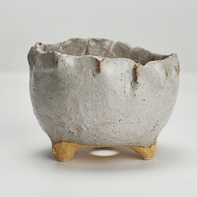艶のある器肌に上から見るとおしゃれなつぼみ型が特徴的な信楽焼の盆栽鉢です。色は落ち着いた白で、土の色との対比でおしゃれに見えることまちがいなしです。3本の足がついていることもこの器の特徴です。