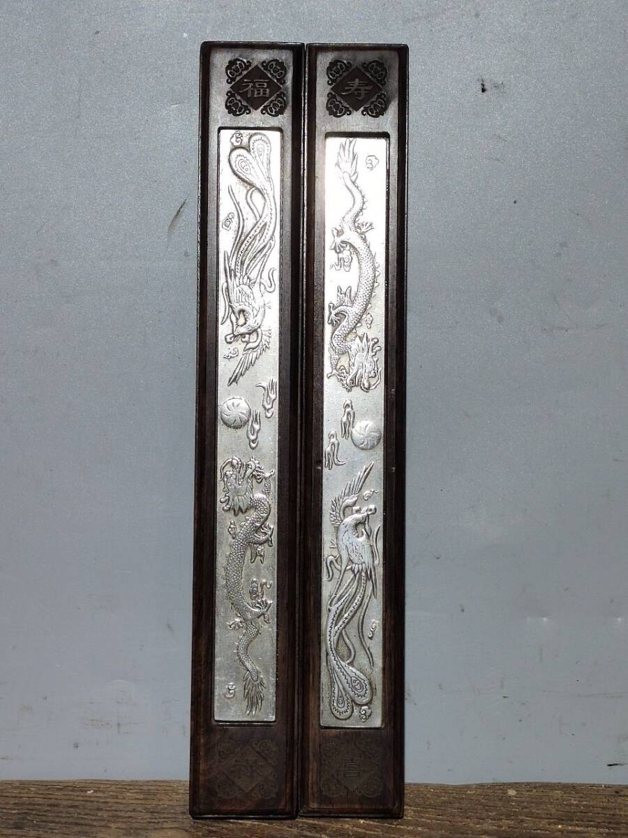 - 蔵友旧蔵出 花梨木製 細密彫 銀條嵌 龍鳳呈祥紋 鎮尺一對 文房具 置物 古賞物 中国古玩 中国古美術品