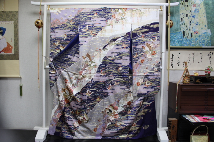 - きもの今昔8766 ふりそで 正絹高級綸子地 白地と紺色大雪輪型 すすき野に蝶の乱舞と華紋柄金箔加工入り 身丈166cm
