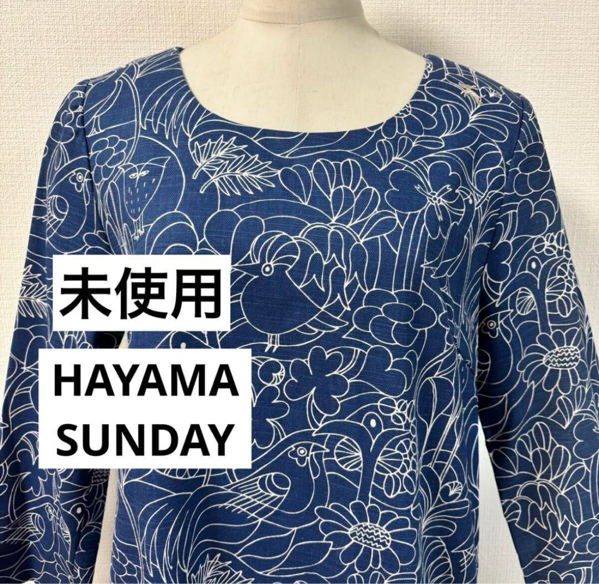 - 未使用◇HAYAMA SUNDAY◇リネン総柄ワンピース◇ブルー◇鳥*花柄