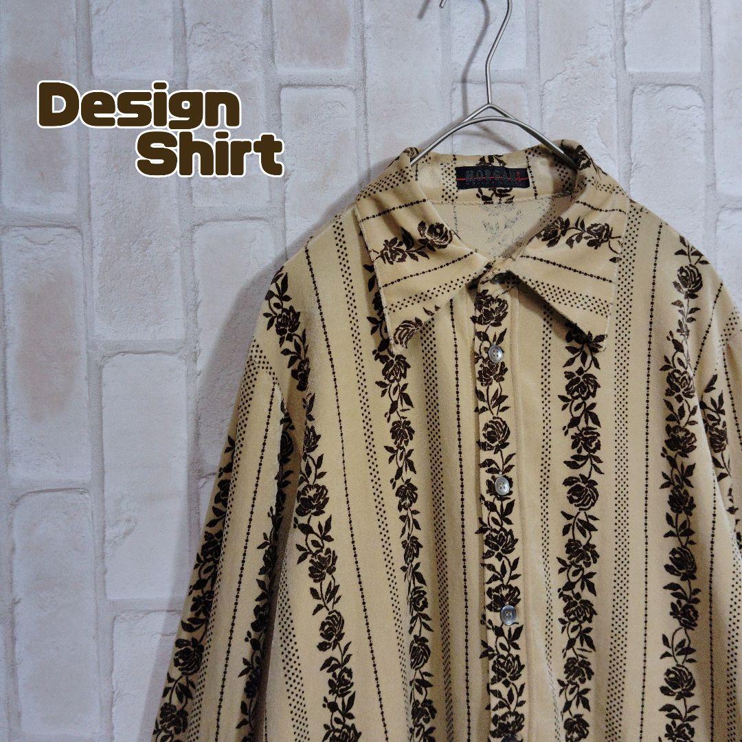 - デザイン シャツ 長袖 ベロア 総柄 ベージュ 花柄