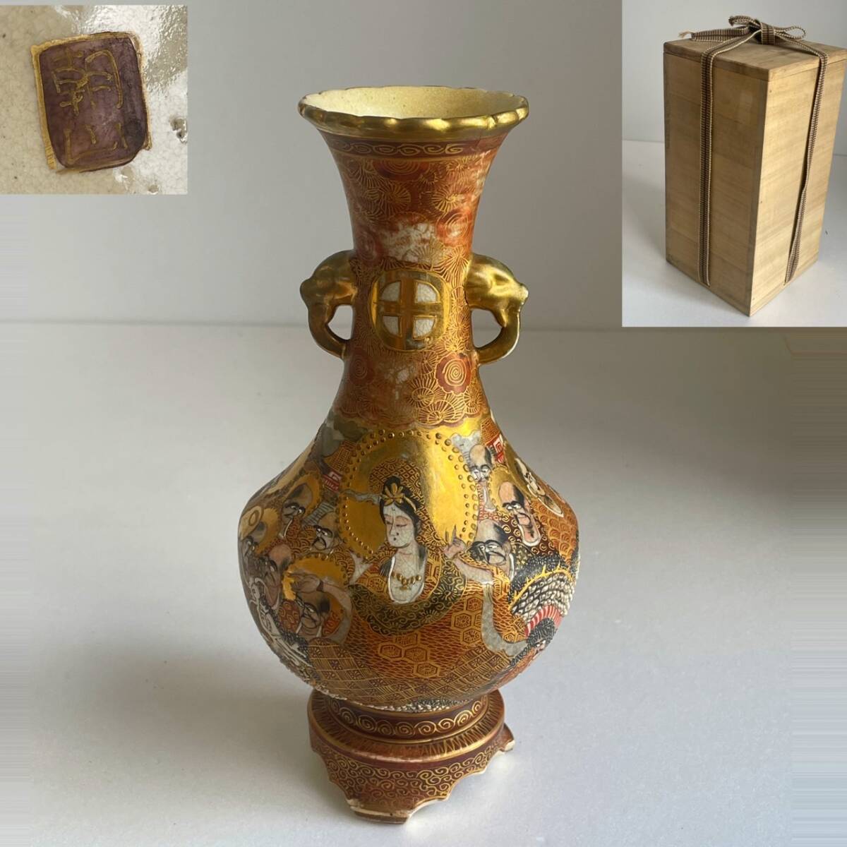- 【和美】時代 薩摩焼 金彩龍人物図 花瓶 木箱付 花器 仏画 19