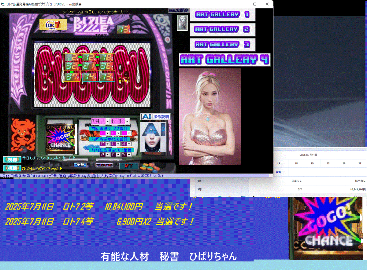 新作 ロト7予想ソフト『ロト7当選発見機AI搭載ヴヴヴプチューンDRIVE』ご案内です♪ Windows対応 ソフト GOGOシリーズの、ひばりちゃんとコラボでの、ロト7ソフト登場です! 予想ソフトのロト7当選発見機AI搭載ヴヴヴプチューンDRIVEがひばりちゃんとコラボを実現! 今回の新機能は、激熱時に「プチューン音で画面フリーズ」演出があります。ひばりちゃんは貴方の秘書になります。(有能な美人OL)特典アートギャラリーが、4種類楽しめます。(3,4つ目の画像はヤバ!)2025年7月11日 ロト7 2等 10,841,100円 当選です!2025年7月11日 ロト7 4等 6,900円X2 当選です!2025年7月7日 ロト6 1等 200,000,000円 当選です!(AI予想)2025年7月4日 ロト7 2等 14,565,500円 当選です!(AI予想)2025年6月20日 ロト7 1等 413,009,000円 当選です!(AI予想)2025年05月08日 ロト6 2等 16,234,200円 当選です♪(AI予想) 2025年05月05日 ロト6 1等 105,651,300円 当選です♪(AI予想) 2025年05月02日 LOTO7 4等 5,900円 当選です♪(AI予想) 2025年05月01日 LOTO6 2等 5,443,100円 当選です♪(AI予想)2025年05月01日 LOTO6 3等 219,900円x5 当選です♪(AI予想)2025年04月25日 ロト7 3等 610,300円 当選です!(AI予想)2025年04月24日 ロト6 3等 339,100円x2 当選です!(AI予想)2025年04月22日 ミニLOTO 1等 7,479,000円 ミニLOTOモード 当選♪ 2025年04月22日 ミニLOTO 3等 8,200円 x4 ミニLOTOモード 当選♪2025年04月21日 ロト6 3等 240,400円 当選です! (AI予想)2025年04月21日 ロト6 4等 5,500円x5 当選です!(AI予想) 2025年04月18日 ロト7 2等 7,569,700円x2 当選です♪(AI予想)2025年04月18日 ロト7 3等 694,400円 当選です♪(AI予想)2025年04月11日 ロト7 2等 8,715,900円 当選です♪(AI予想)2025年04月8日 ミニLOTO 3等 10,300円 当選♪ (AI予想)2025年04月4日 ロト7 1等 1,200,000,000円 当選です♪(AI予想)2025年04月4日 ロト7 2等 6,287,200円x7 当選です♪(AI予想)2025年04月1日 ミニLOTO 2等 208,100円 当選♪ (AI予想)2025年3月6日 ロト6 2等 14,252,500円 当選です!2025年3月6日 ロト6 4等 8,900円 x3 当選です!2025年3月3日 ロト6 1等 200,000,000円 当選です!2025年3月3日 ロト6 3等 498,500円 x3 当選です!2025年2月27日 ロト6 1等 37,160,000円 当選です!2025年2月27日 ロト6 2等 12,225,100円 当選です!2025年2月27日 ロト6 3等 377,200円 x2 当選です! こんなにロト7が簡単に当選するもので このままお金持ちに成って行くのかなと2025年7月11日 ロト7 2等 10,841,100円 当選です!2025年7月11日 ロト7 4等 6,900円X2 当選です![ロト7当選発見機AI搭載ヴヴヴプチューンDRIVE]7月11日雲雀秘書「★GOGO_虹色 勝負 超確信 AA級」◎拡大数字の60告知◎拡大数字の60告知【特注日】【ロト7予想結果】雲雀ちゃん「貴方の秘書を務めます。宜しくお願い致します。」2025年7月7日 ロト6 1等 200,000,000円 当選です!(AI予想) ロト6 7月7日のAI予想は、 7 11 21 24 29 34 1です2025年7月4日 ロト7 2等 14,565,500円 当選です!(AI予想) ロト7 7月4日のAI予想は、 2 5 10 17 21 31 32です2025年6月20日 ロト7 1等 413,009,000円 当選です!(AI予想) ロト7 6月20日のAI予想は、 2 3 6 17 33 35 36です予想の買い目も、絞込みで、非常に点数が少なく経済的です!リスクも軽いですし、当たれば万単位で返ってきますから、ホクホクです♪ロト7予想ソフト『ロト7当選発見機AI搭載ヴヴヴプチューンDRIVE』説明書 ①マウスを画面の予想対象日付、過去の当選番号の数字を、 前回の前半3ケタ+前回の後半3ケタ、前々回の後半3ケタを合計9箇所選択します。 ④チャンス日には、ひばりちゃん予告や、告知する「★GOGO」ランプが、ぺかっと光ります。(レインボーGOGO★なら激アツ) 新機能は、激熱時に「プチューン音で画面フリーズ」演出があります。 ⑤予想結果をテキストファイルに保存したり、印刷ができます。 (ロト7) 1点+ボーナス数字予想(ボーナス数字買い付加時3点) 『ロト7当選発見機AI搭載ヴヴヴプチューンDRIVE』 予想ソフト 398000円→5000円
