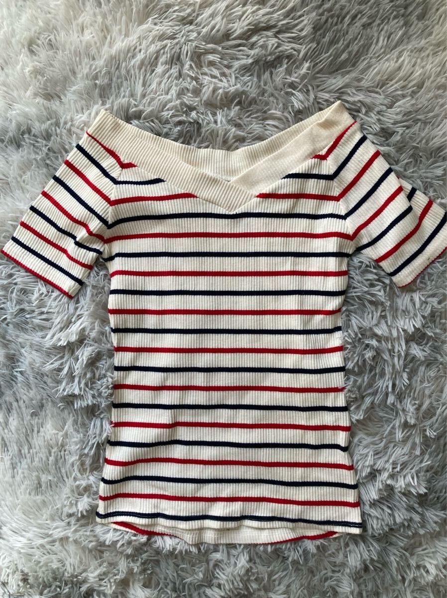 - イング INGNI 赤紺ボーダーVネックコットンリブTシャツ M美品20