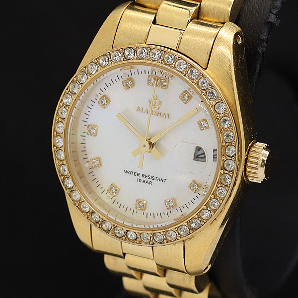 - 1円 稼働 良品 マーシャル QZ シェル文字盤 ストーンベゼル レディース腕時計 2000000 7APY IGR