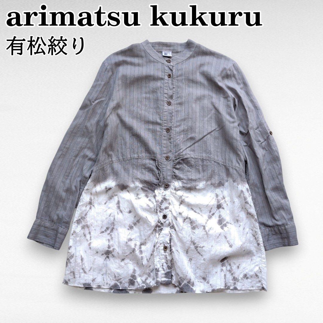- 美品 arimatu kukuru アリマツククル 有松絞り 和 チュニック 長袖ブラウス シャツ グレー バイカラー レディース 250718-12