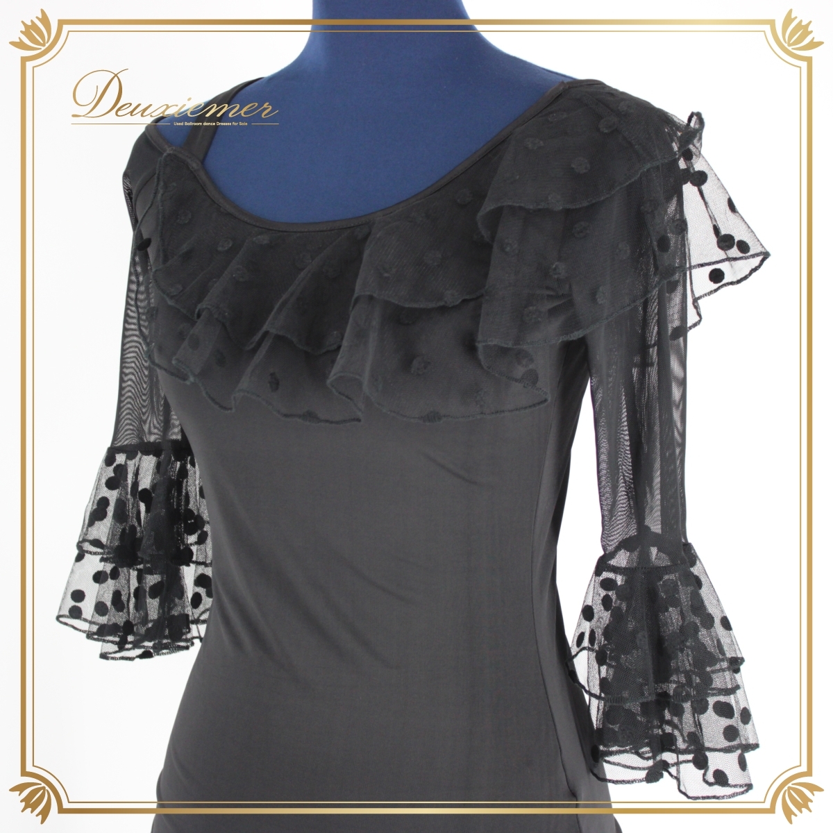 > 『送料無料』 【美品 社交ダンス衣装】ブラック系 黒 トップス レッスン パーティー 水玉 ドット レース 長袖 シンプル 無地 かわいい