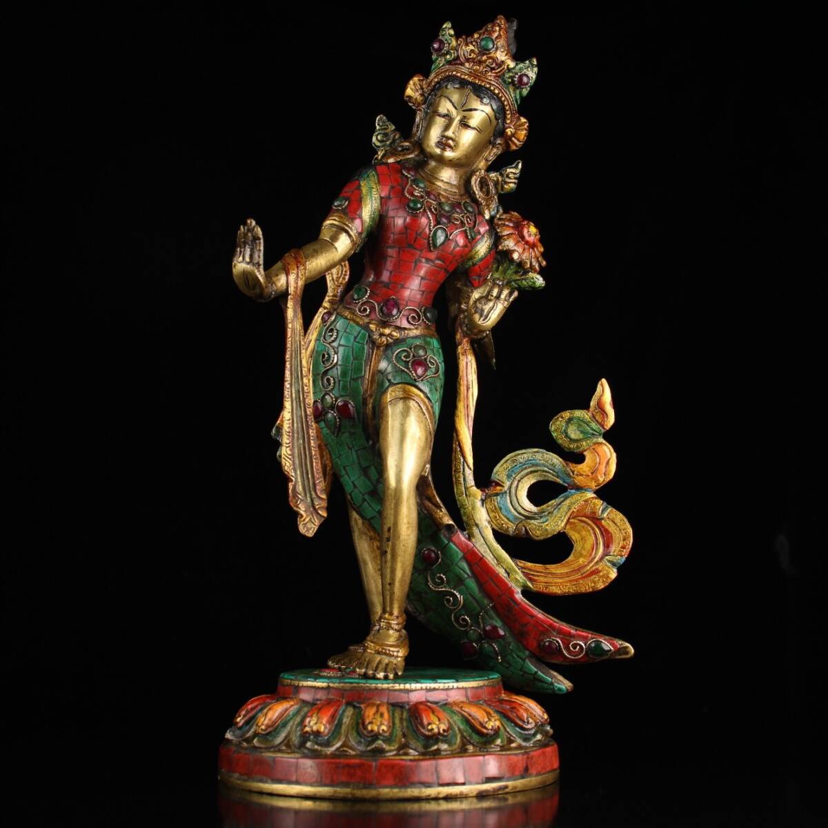 - ▽鴻▽ 銅製 寶石嵌 描金 彩繪 站綠度母像 仏像 宗教 仏教古美術 供養品 古賞物 古董品 時代物 稀少珍品 中国古玩 中国古美術
