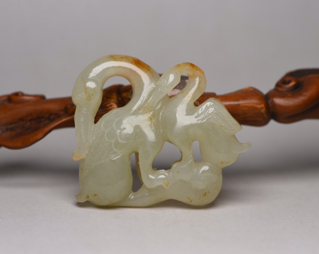- ▽鴻▽ 和田玉製 細密彫 仙鶴 置物 賞物 古賞物 古董品 時代物 稀少珍品 中国古玩 中国古美術