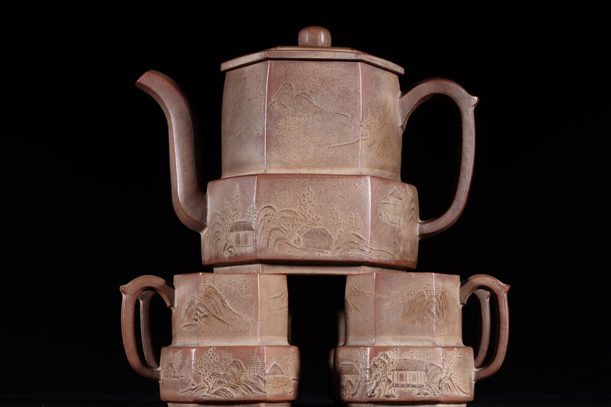 > 【瓏】紫砂彫 泥絵六方套壺 周季山銘 明時代 中国陶磁器 陶芸 後手急須 茶壷 茶道具 置物 古美術 蔵出