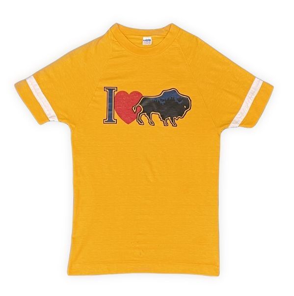 - 70’s 米国製 バータグ チャンピオン Champion ビンテージ Tシャツ ラグラン I LOVE BISON イエロー M [ta-1472]
