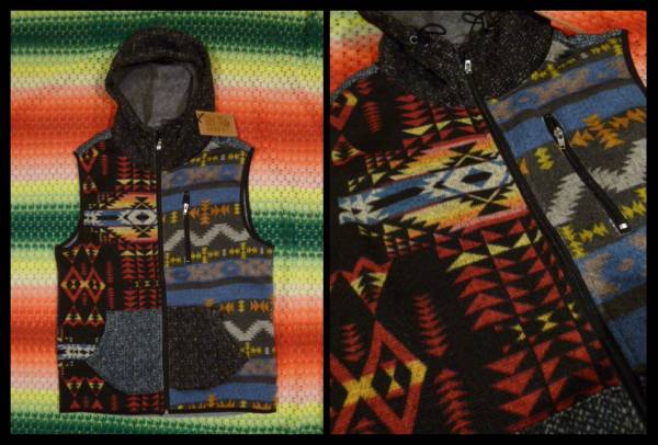 - ネイティブ ツイード柄 フードベスト Mサイズ クレイジーカラー 切り返しデザイン