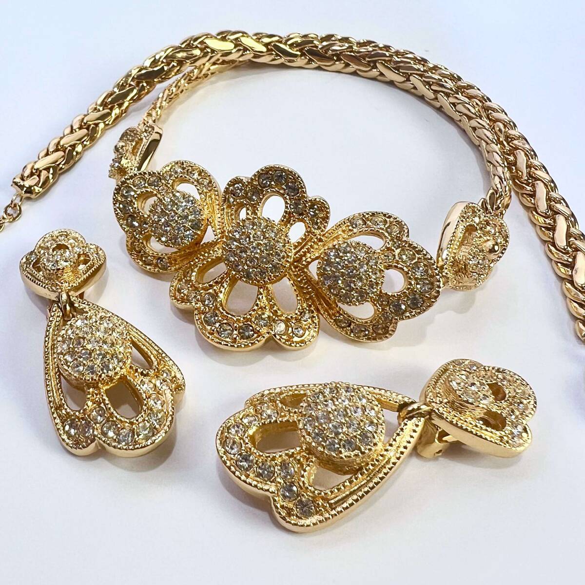 > Christian Dior クリスチャンディオール フラワーモチーフ ラインストーン ネックレス イヤリング セット GP レア アクセサリー 希少 美品