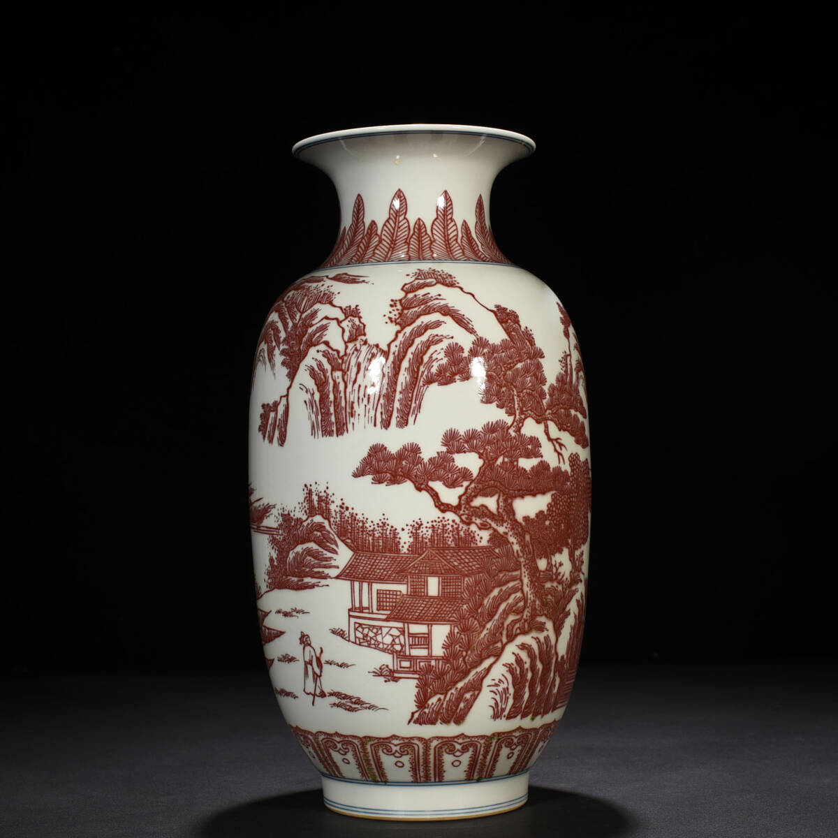 - ■TM163■大清乾隆年制款 釉里紅山水人物紋灯籠瓶 時代物 古玩 唐物 古陶磁器■